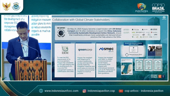 11月10日至21日,《联合国气候变化框架公约》第三十次缔约方大会(COP30)在巴西贝伦(Belém)举行。全球约193个国家/缔约方,逾56000人次参与了本次活动。华友作为印尼镍下游产业化转型的“核心推动者”之一、绿色减碳优秀企业代表,受印尼环境部邀请参加本次活动,响应大会主题。