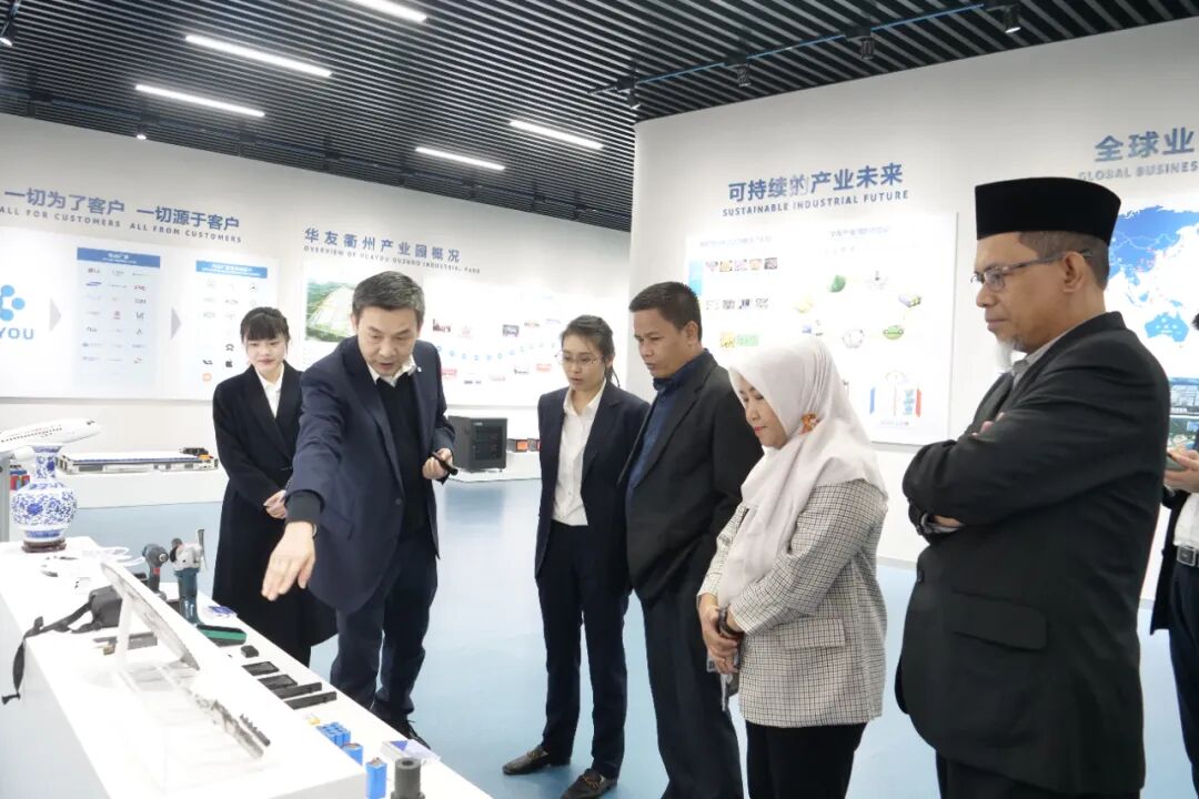 来访期间,鲁斯迪·努尔校长一行实地参观了华友衢州产业园区前驱体、正极材料等主要生产车间,走访了衢州职业技术学院校史馆、数字中枢、工业互联网实训中心、智能制造实训中心等。