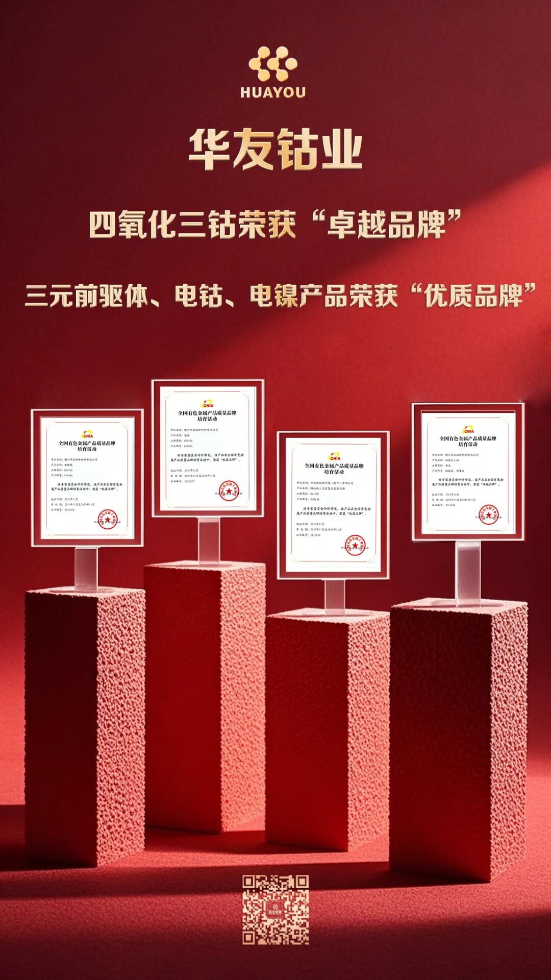 全国有色金属产品质量品牌培育评价活动围绕企业原料管控、工艺控制、装备水平、质量管理、检测检验、绿色生产、智能制造及品牌建设等维度,历经多个严格程序,对通过审定产品分别授予“卓越品牌”“优质品牌”和“培育品牌”称号,具有显著的行业示范与引领作用。华友在首届品牌培育活动中即斩获“卓越品牌”和“优质品牌”荣誉,不仅是对华友在科技品牌建设方面的高度认可,也是对华友长期以来优异产品品质的认同。