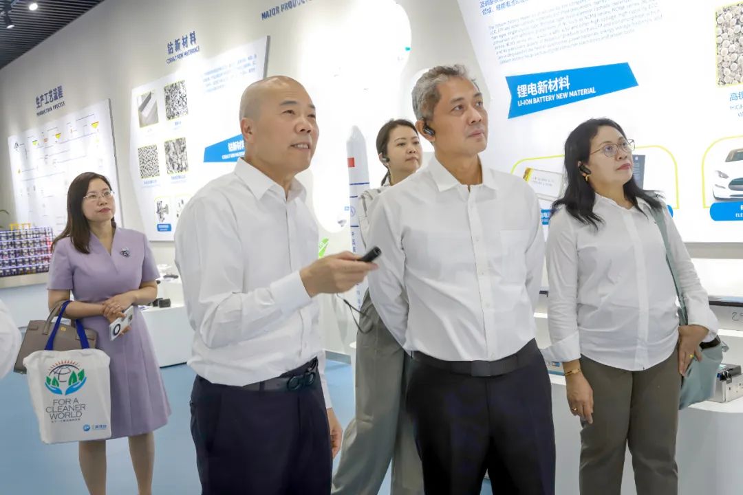 座谈交流前,Sigit Reliantoro 阁下一行先后前往华友展厅、绿色精炼产线、三元正极智造产线及研发中心实地参观考察。在参观过程中,考察团详细了解了华友在工艺技术研发、智能化生产运营等方面的成果,对企业展现出的领先工艺技术、高度智能化的产线布局以及现代化的工厂管理水平给予了高度评价与充分肯定。