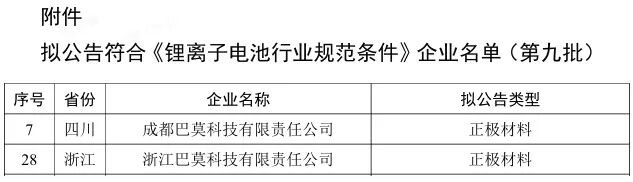 近日,国家工业和信息化部公示第九批符合《锂离子电池行业规范条件》的企业名单,全国共有36家企业入选,华友新能源产业集团旗下成都巴莫科技有限责任公司与浙江巴莫科技有限责任公司同时入选。此前,天津巴莫科技有限责任公司已于2016年入选该规范条件首批名单,标志着产业集团在锂电池行业的规范发展与综合实力获得国家级认可。
