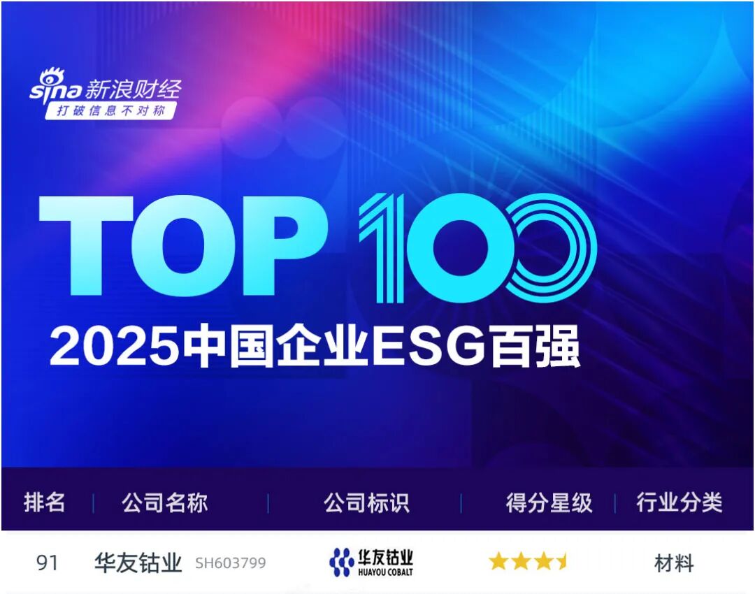 近日,新浪财经发布“2025中国企业ESG百强”榜单,华友钴业凭借在环境(E)、社会(S)、公司治理(G)的出色表现,成功从5000余家A股上市公司及在港上市内地企业中脱颖而出,入选该榜单,位列第91位。此次入选不仅彰显了权威机构对华友钴业可持续发展实践的高度认可,更确立了华友作为新能源行业ESG标杆企业的领先地位。